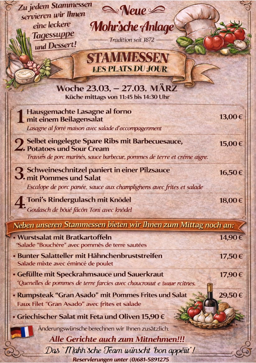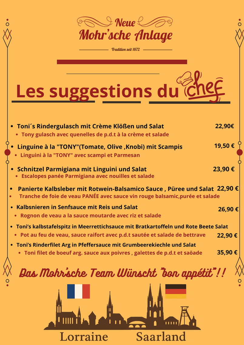 Die besondere Grenzsituation unseres Gasthauses prägt auch unsere Speisekarte. Ob nun die in Frankreich so beliebten Froschschenkel auf der Wunschliste stehen, oder die deftigen Saarländische "Gefillde" oder "Hoorische", wir bieten alles!