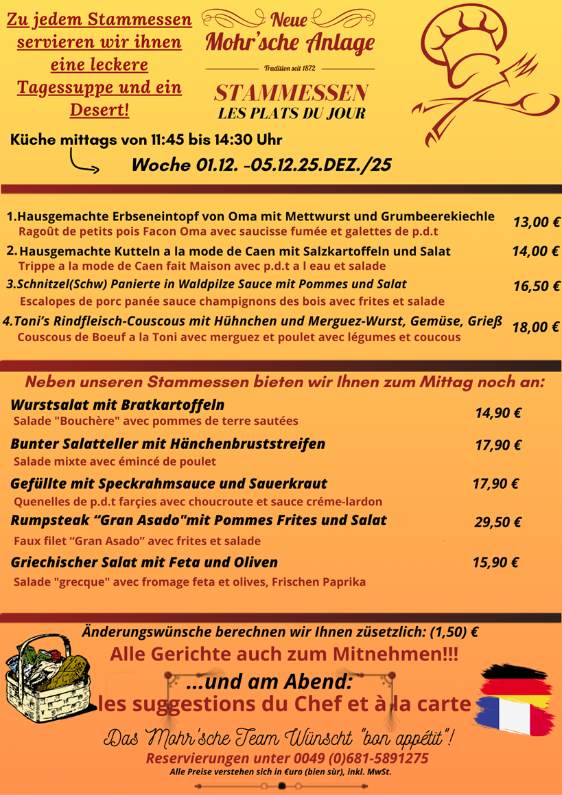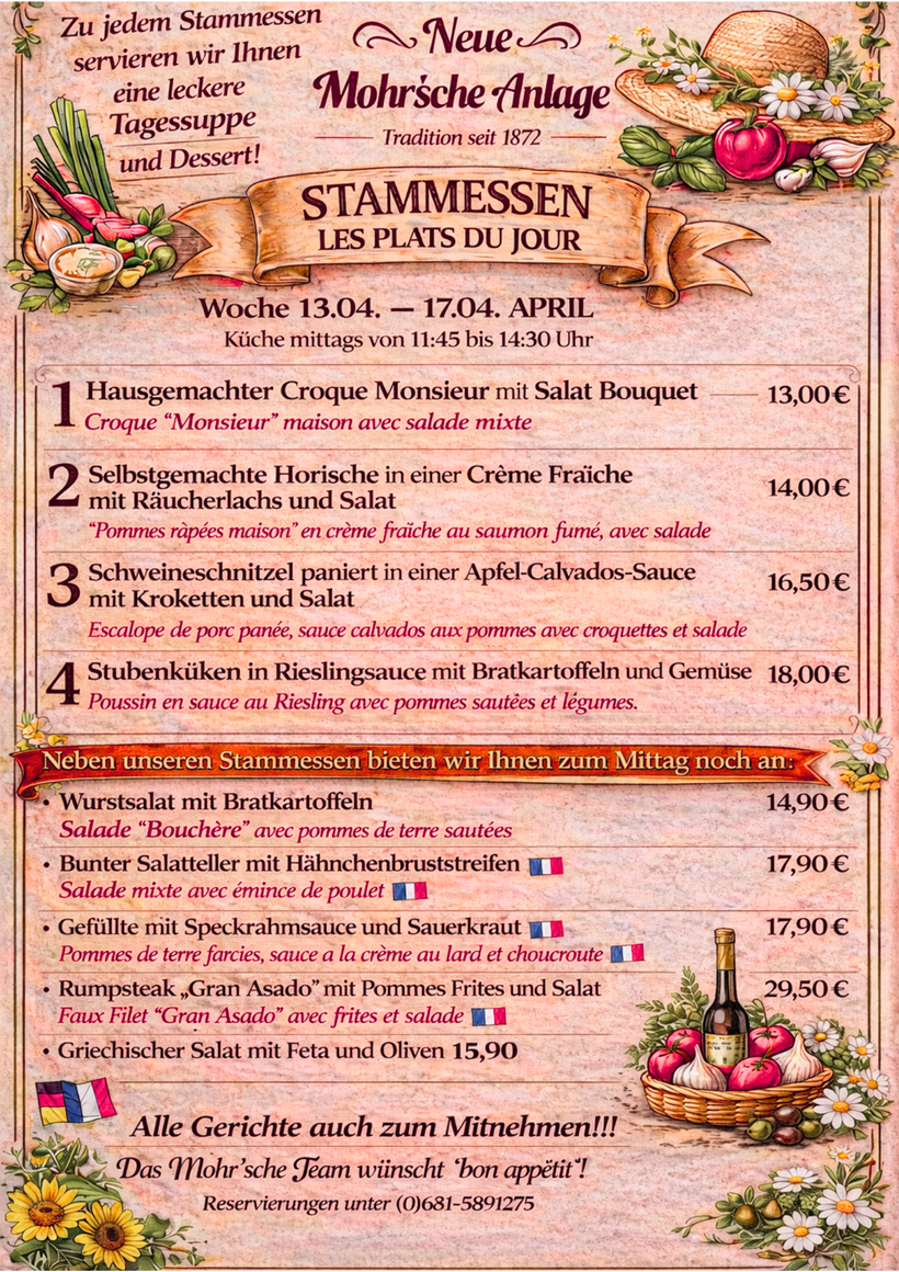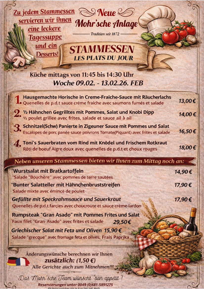 Die besondere Grenzsituation unseres Gasthauses prägt auch unsere Speisekarte. Ob nun die in Frankreich so beliebten Froschschenkel auf der Wunschliste stehen, oder die deftigen Saarländische "Gefillde" oder "Hoorische", wir bieten alles!