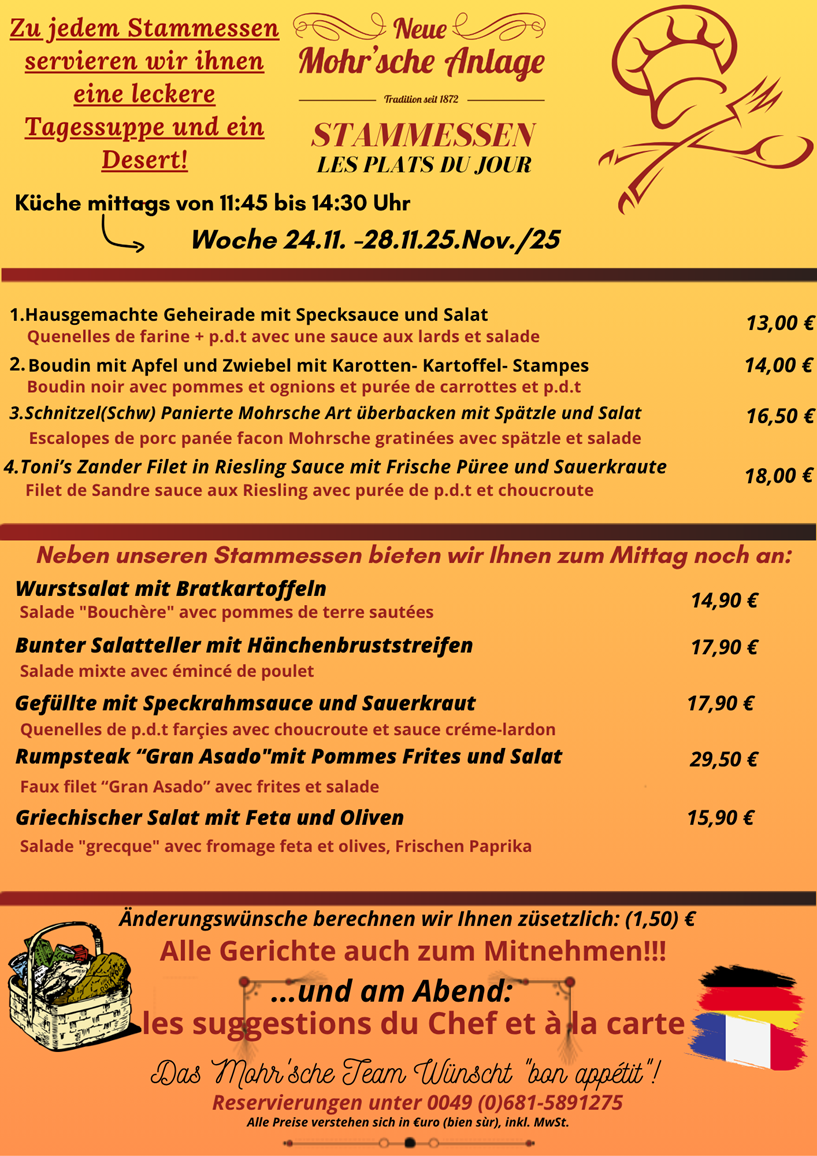 Die besondere Grenzsituation unseres Gasthauses prägt auch unsere Speisekarte. Ob nun die in Frankreich so beliebten Froschschenkel auf der Wunschliste stehen, oder die deftigen Saarländische "Gefillde" oder "Hoorische", wir bieten alles!