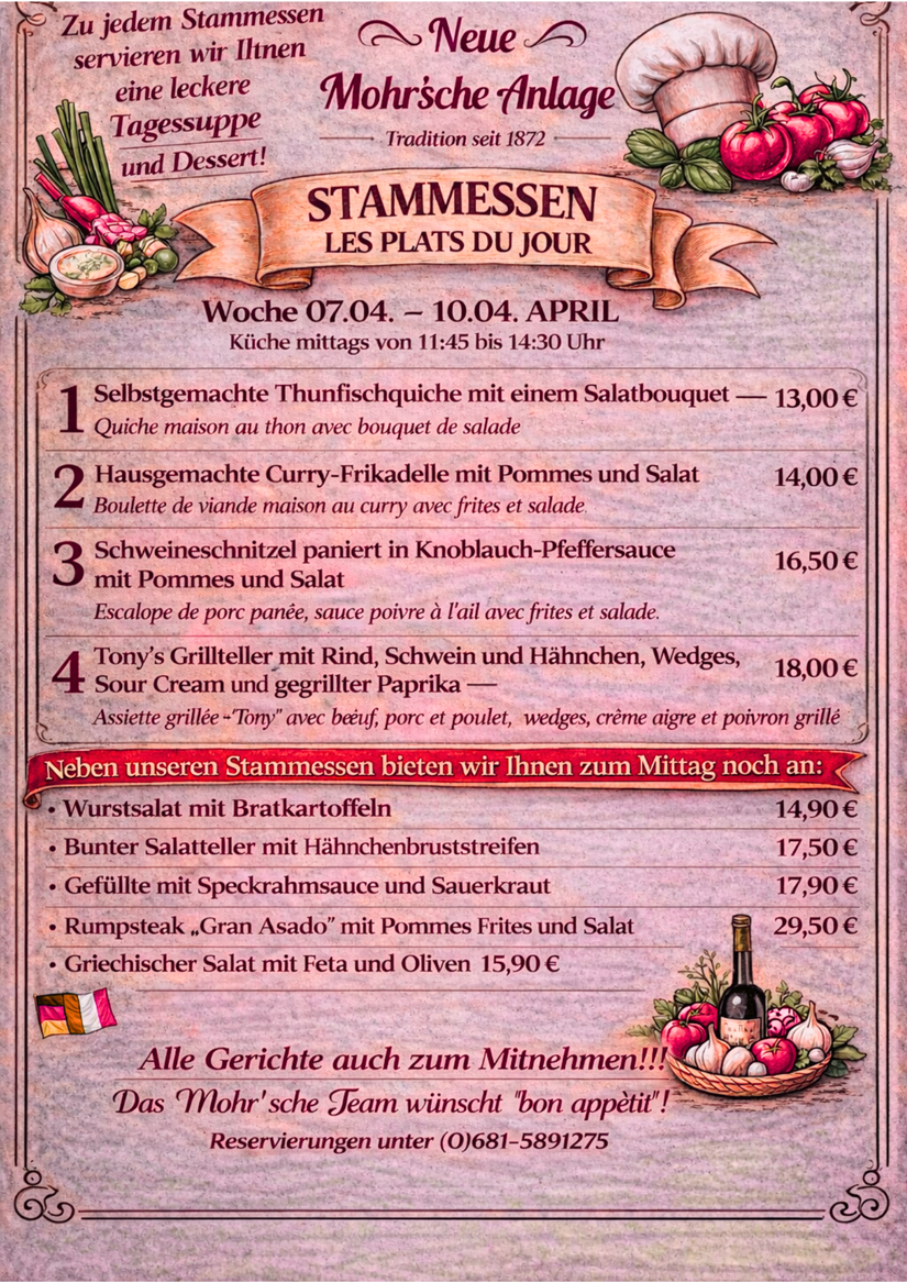 Die besondere Grenzsituation unseres Gasthauses prägt auch unsere Speisekarte. Ob nun die in Frankreich so beliebten Froschschenkel auf der Wunschliste stehen, oder die deftigen Saarländische "Gefillde" oder "Hoorische", wir bieten alles!