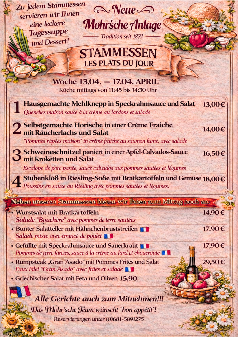 Die besondere Grenzsituation unseres Gasthauses prägt auch unsere Speisekarte. Ob nun die in Frankreich so beliebten Froschschenkel auf der Wunschliste stehen, oder die deftigen Saarländische "Gefillde" oder "Hoorische", wir bieten alles!